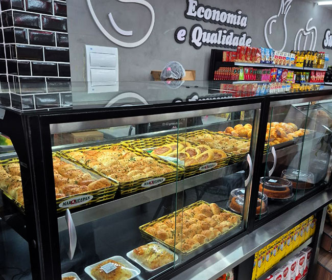 Além das opções para compras, a loja também conta com mesas para quem prefere consumir no local, criando um ambiente para lanche ou pausa ao longo do dia.